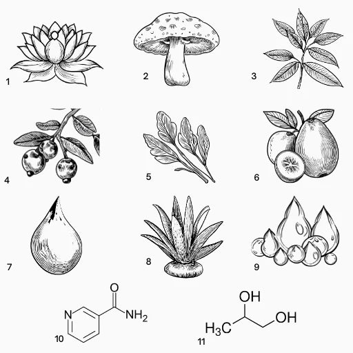 Aqua, Cyclopentasiloxane, Dimethicone, Butyl Methoxydibenzoylmethane, Ethylhexyl Methoxycinnamate, Niacinamide, Propanediol (And) Aqua (And) Fomes Officinalis (Mushroom) Extract, Nelumbo Nucifera (Lotus) Leaf Extract, Octocrylene, Butylene Glycol, Angelica Gigas (Korean Angelica) Root Extract, Camellia Sinensis (Green Tea) Leaf Extract, Psidium Guajava (Guava) Leaf Extract, Propanediol, Phenoxyethanol, Ammonium Acryloyldimethyltaurate/VP Copolymer, Titanium Dioxide, Parfum, Lecithin, Acrylates/C10-30 Alkyl Acrylate Crosspolymer, Triethanolamine, Ethylhexylglycerin, Disodium EDTA